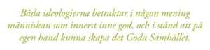 Denna förändring genomfördes inte enbart med socialistiska idéer, utan i stor utsträckning också via idéer hämtade från radikal liberalism. Den förra ideologin byggde på en samhällssyn med klasserna i centrum, den andra mer uttalat på individen. Men det fanns likafullt gemensamma drag i människosyn och framtidsvision. Båda ideologierna betraktar i någon mening människan som innerst inne god, och i stånd att på egen hand kunna skapa det Goda Samhället, ohindrad av yttre begränsningar i form av gudomliga eller mänskliga auktoriteter.