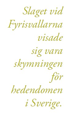 Slaget vid Fyrisvallarna hade utkämpats i den nordiska mytologins två hedniska huvudgudars namn, Odens och Tors. Resultatet av slaget tycks vara en hednisk guds triumf över en annan. Men sammantaget visade sig denna strid vara skymningen för hedendomen i Sverige. De missionärer som kom till Skåne (på 900-talet) markerade verkligen början på en ny era, den kristna civilisationens födelse i Sverige.