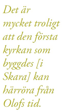 Med en befolkning på cirka tjugotusen invånare är Skara inte den viktigaste staden i Sverige, inte ens i Västergötland. Ändå är det inte bara en av Sveriges äldsta städer, utan det var till och med ett maktcentrum i början av det andra årtusendet. Och än i dag vittnar det faktum att Skara i Västergötland är säte för det äldsta kristna stiftet om dessa gamla tider. Det är därför helt naturligt att besöka Skara domkyrka för detta avsnitt. Kyrkan ligger mitt i stadens hjärta, och även om den nuvarande utformningen är i nygotisk stil från 1800-talet, förmedlar historien att en katedral invigdes här redan i mitten av 1100-talet. Nyare undersökningar tyder dessutom på att en kyrka stod här redan ett århundrade tidigare.5 Det är alltså mycket troligt att den första kyrkan som byggdes på denna plats kan härröra från Olofs tid.