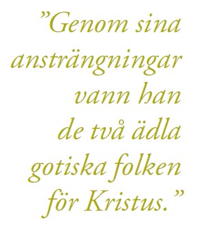 I sin önskan att omvända det folk som lydde under honom till kristendomen, gjorde [Olof Skötkonung] stora ansträngningar för att förstöra avgudatemplet i Uppsala i Mellansverige. Hedningarna, som fruktade hans avsikter, skall ha ingått en överenskommelse med kungen om att han, om han själv ville bli kristen, skulle få ta den del av Sverige som han tyckte bäst om under sin jurisdiktion. I den delen kunde han etablera kyrkan och kristendomen, men inte tvinga någon av folket att ge upp dyrkan av sina gudar om inte någon av egen fri vilja önskade bli omvänd till Kristus. Kungen var nöjd med en sådan överenskommelse och grundade snart en kyrka och ett biskopssäte för Gud i västra Götaland, vilket är den region som ligger närmast danerna och norrmännen. Den största staden är Skara, där ärkebiskop Unwan på begäran av den mest kristne kung Olaf vigde Thorgaut till den förste biskopen. Denne man genomförde energiskt sin mission bland hedningarna och genom sina ansträngningar vann han de två ädla gotiska folken för Kristus.6